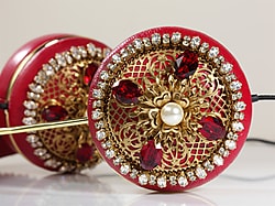 This red Nappa leather headphone is perfect for those who want to be more understated, but still get noticed. Embellished with Swarovski crystals and pearls, along with custom gold-toned filigree, this piece is truly a (wearable) piece of art.